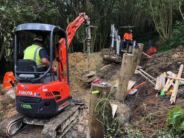 The Settlers Track Slip Repairs project focused on repairing slips and constructing new timber post retaining walls along the Settlers Track walking trail alongside the Waikato River.